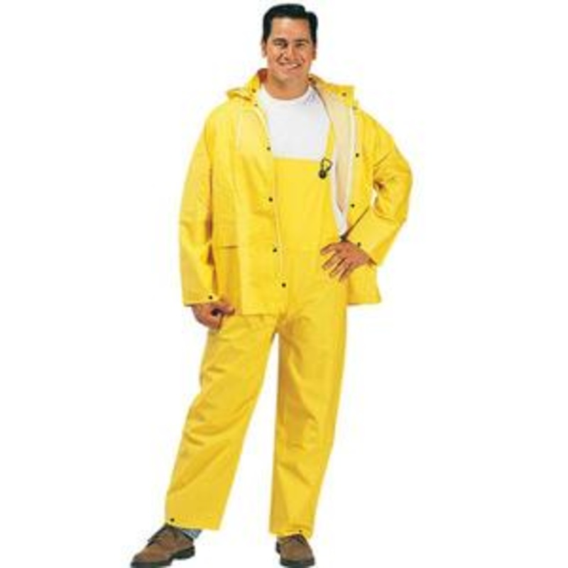 0.35 mm thicknessHeat welded stitches and heavy, PVC-reinforced jointCorduroy collar jacket with detachable hood and bib overall pantsZipper front with storm fly front snapsUnderarm air vents for breathabilityCape-vented backTwo front flapped pocketsAdjust
