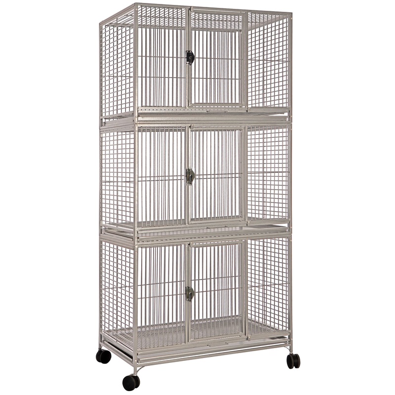 Features: 3 separate units to hold multiple birds. Bird proof front door and front foor safety latch. 3 slide out grills & trays. Horizontal side bars, vertical bars front & back. 3 large front doors for easy access. 6 swing out feeder doors. 3 breeder door boxes. 6 stainless steel feeder cups. 3 perches. 4 easy rolling casters. Nontoxic, durable and safe powder coated finish