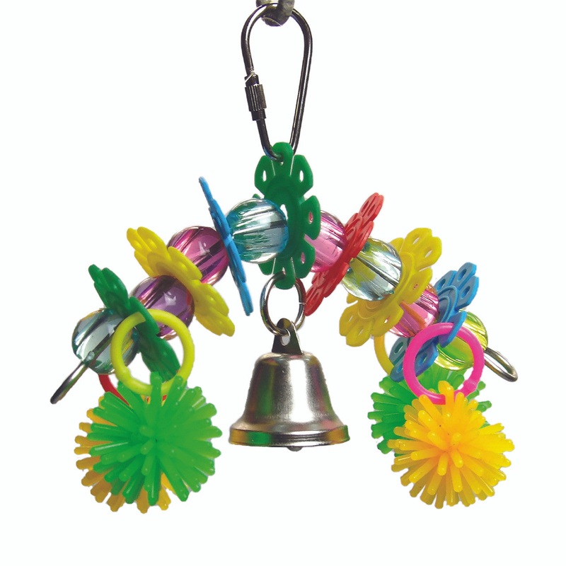 A&E Happy Beaks Rainbow Bridge is a colorful bird toy perfect for your small bird. Made with plastic beads and rings, pompoms and finish with a bell. Birds will love to climb and chew on all the various materials.
