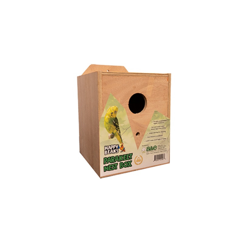 A&E Cage Parakeet Nest Box is built with hardwood and has an easy open top for cleaning and removal of nesting materials. -Durable Unvarnished Poplar Wood-Carved inside indent to keep eggs from rolling-Large opening for easy access and cleaning-Use indoor