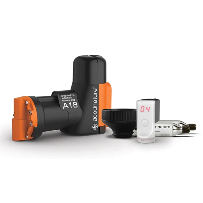 The A18 Squirrel trapping kit has everything you need to confidently and efficiently control squirrels and large rodents in your area. It also comes with theDigital Strike Counterwhich allows users to verify the traps in field success. The Squirrel Trapping Kit startes with the incredible Goodnature A18 Squirrel trap. The A18 is a unique Squirrel and Large Rodent Trap that automatically resets, uses a DIYLure Basketsystem for customized lure solutions by users and is a certified humane trapping unit. The A18 isn’t powered by electricity nor does it have to be reset after every strike. The A18 trap is powered by aC02 Gas Canisterthat provides 18 strikes per cartridge. Once your trap is armed it will automatically reset after each strike, meaning no more need to check your traps every day! Like all great traps, your success will partially rely on the lure selected by the user. The A18 is no different Squirrels can be attracted to many food sources and this flexibility in food source is why the A18 makes use of the DIYLure Basket. The DIY lure basket gives users the flexibility to select what lure in the area is most effective at trapping squirrels and/or other large rodents.Should the user want a tried and tested humane, toxin free solution, please see ourGoodnature 50g Automatic Paste Pumps (ALPs). These pumps are certified toxin free and function for up to 6 consecutive months.