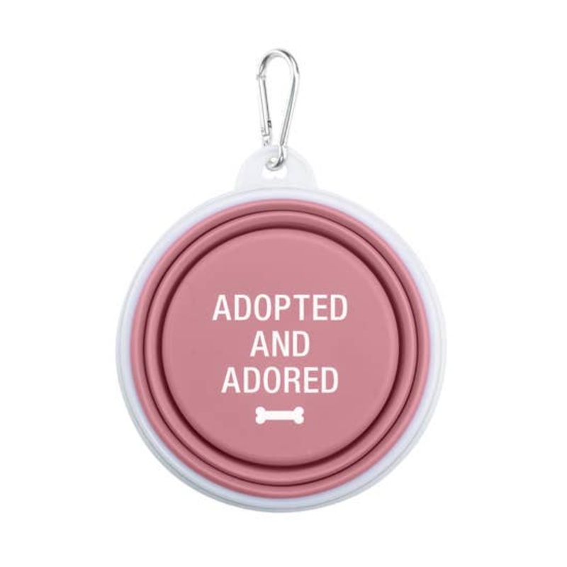 Adopted Dog BowlOur hilariously fun and functional silicone dog bowls include a carabineer to attach to a belt, backpack, or purse so your furry friend always has water or food on the go! Capacity: 12oz. Material: Silicone, Metal.
