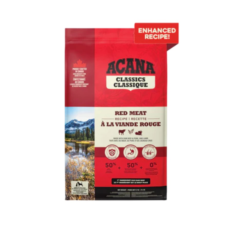 ACANA recipes are thoughtfully crafted from start to finish with delicious, quality ingredients. With a balanced 50/50 split between rich meat ingredients and nutritious fruit, grains and vegetables, ACANA Classics Red Meat recipe provides your dog with a filling and nutritious meal crafted from simple, wholesome ingredients. It also includes nutrient-rich ingredients that support three key health benefits, including immune function, healthy digestion, and healthy skin and coat. Feed your dog premium nutrition at a classic price with ACANA Classics Red Meat recipe.