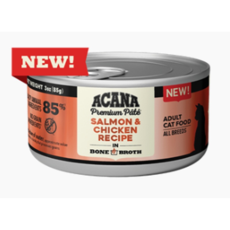 ACANArecipes are thoughtfully crafted from start to finish with delicious, quality ingredients. ACANAPremium Pt Salmon & Chicken Recipe in Bone Broth is specially crafted to nourish your cat with 85%premium animal ingredients. Our premium pate also include