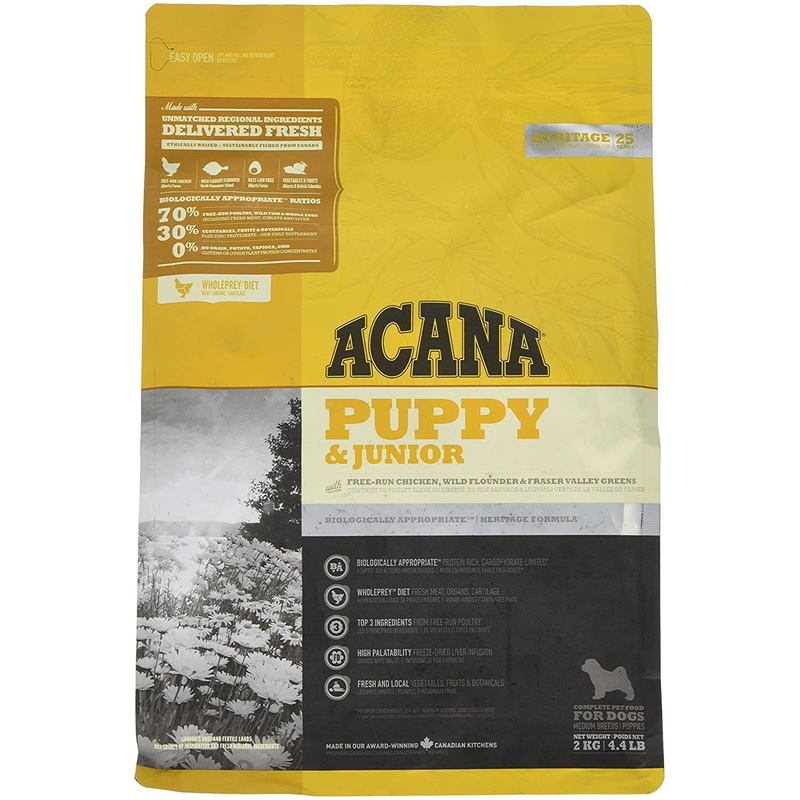 By nature, all puppies are carnivores which means they’re biologically adapted for a diet rich and varied in fresh whole meats with smaller amounts of fruits and vegetables. That’s why ACANA Puppy & Junior is brimming with free-run chicken and nest-laid eggs and wild-caught flounder from North Vancouver Island. Free of grains and fast carbohydrates such as rice, tapioca or potato, ACANA is rich in meat proteins to promote your puppy’s peak development and conditioning. Biologically appropriate ACANA is guaranteed to keep your puppy healthy, happy and strong. 2kg.