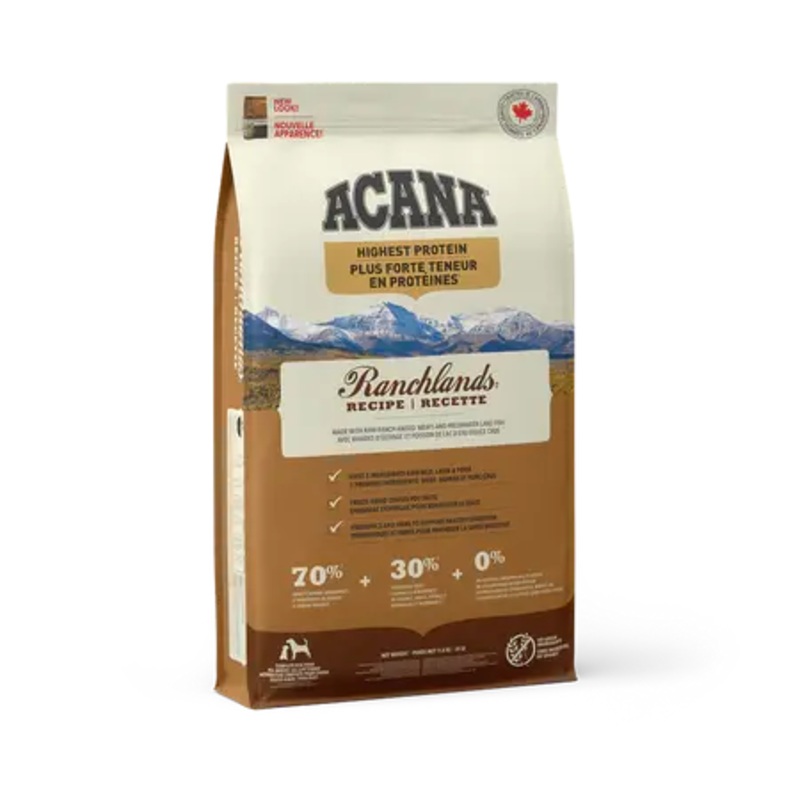 Every ACANArecipe is thoughtfully crafted from start to finish with premium ingredients. With the highest protein offering in ACANA pet foods, our ACANA Highest Protein RanchlandsRecipe is rich with 70%1quality animal ingredients like ranch-raised4beef, po