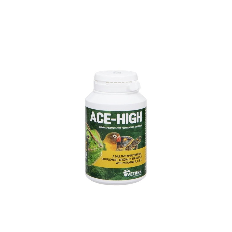 Composition: Dextrose, Dicalcium phosphate, Calcium carbonate, Sodium chloride ACE-Highis avitamin supplementwhich has been speciallyformulated to provide high levels ofvitamins A, C & E, crucial in aiding animals such as fish, birds and reptiles through periods of stress and disease. The enhanced levels ofvitamins A, C & E along with other vitamins and minerals including B1, B2, B6 & B12 have been proven to improve the health of animals. ACE-High should be mixed into food at a rate of 0.1g (1 normal pinch) per kilo of animal being supplemented. For animals receiving complete diets please consult your veterinary surgeon for advice.
