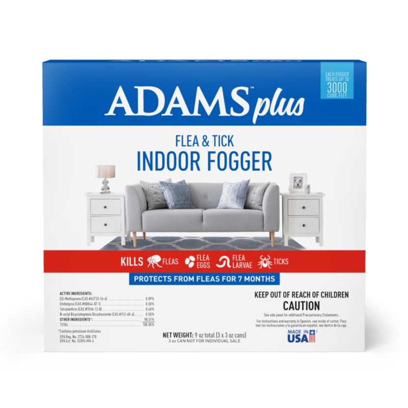 Adams Plus Flea & Tick Indoor Fogger reaches fleas and bugs hidden in carpets, drapes, upholstery, and more.Kills fleas, ticks, flea eggs, flea larvae, mosquitoes, ants, spiders, cockroaches, and silverfishProtects from fleas and prevents re-infestation fo