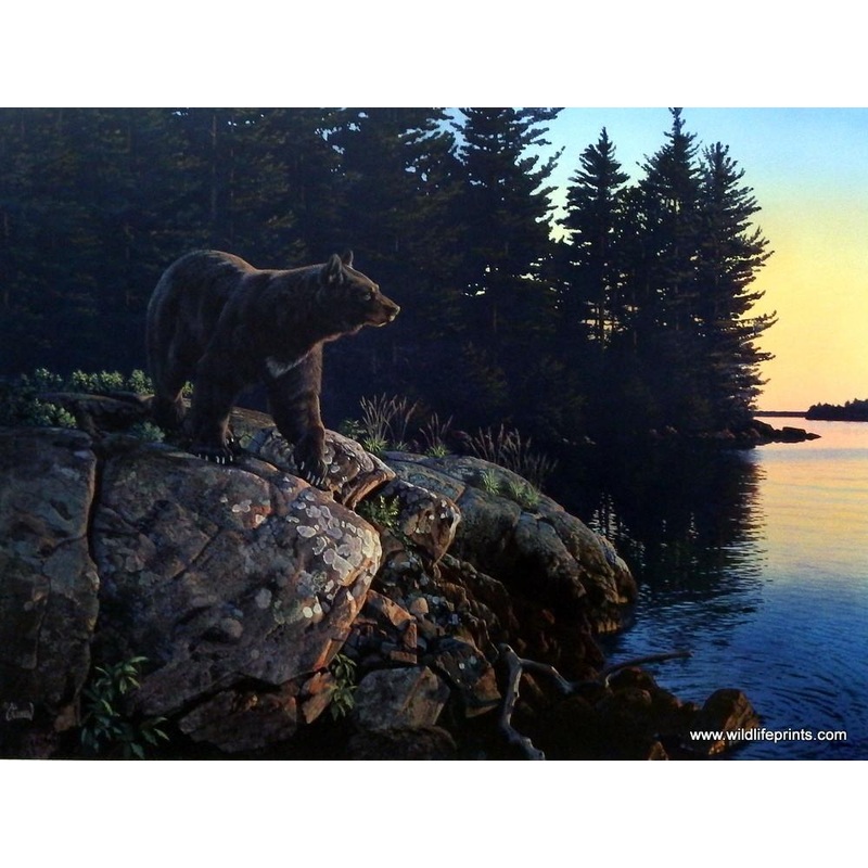 In Al Agnew's print EVENING CALM a lone bear stands on the rocky cliffs at the edge of a river searching the horizon for food and danger. Although bears eat other animals, and they really love fish, they refer a mostly vegetarian diet--fruits, berries, nut