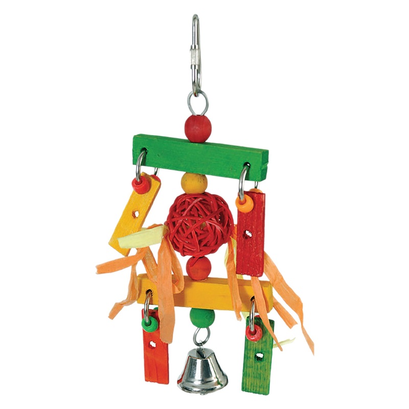 Includes: 1 Toy Intended For: Small birds e.g. Parakeets, Cockatiels, Lovebirds, Parrotlets, etc. Activity: Exercise, PlayColor: AssortedMaterial: Wood, Willow Ball, metal Hanger & Carabiner