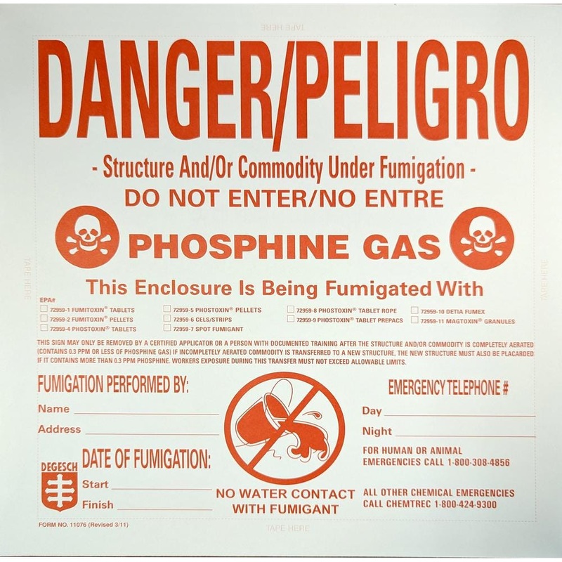 Degesch AmericaWarning Sign for Building Fumigation - Aluminum Phosphide DangerMore Information Package Size: Each Manufacturer: Degesch ID: 620691