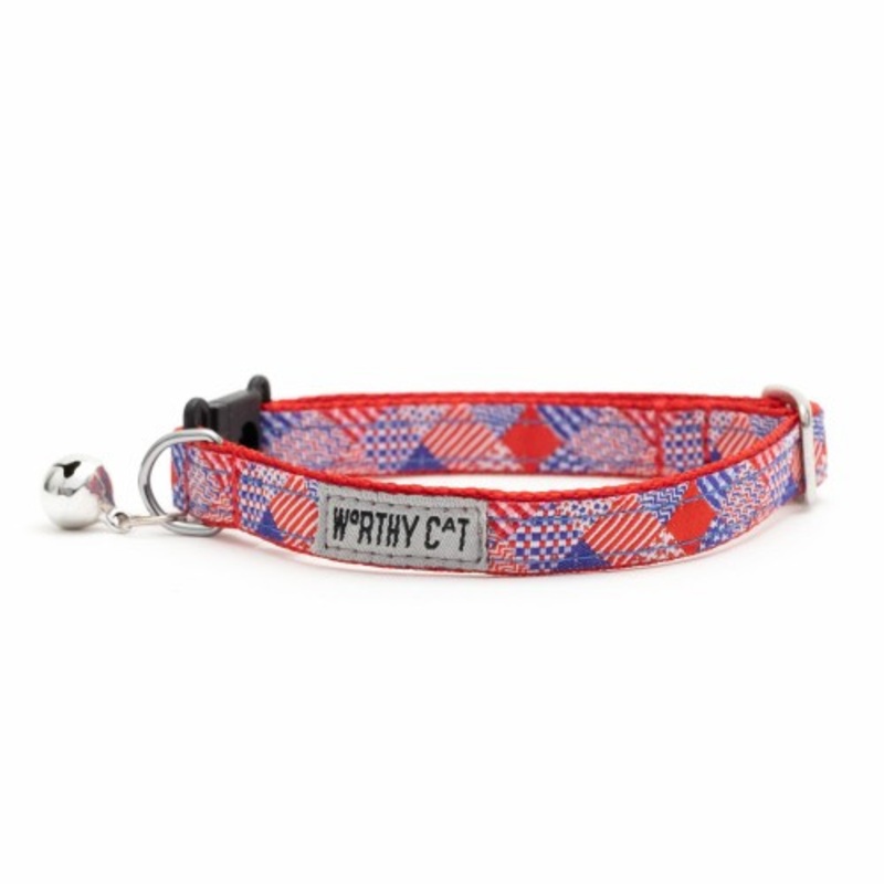 AmericanaCat Collar Adjustable Safety snap clasp Bell to help find kitty and protect wildlife Adjustable collar focused on both durability and style, featuring woven ribbon sewn onto comfortable and durable nylon webbing with a breakaway snap clasp, nickel