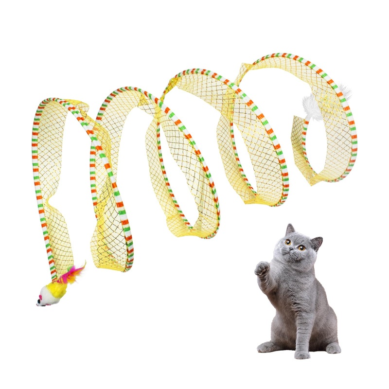 Andiker Cat Tunnel S-Shape Collapsible Pet Interactive Play Toy with Feather Sisal Ball Cat Tube Tunnel for Kitten Small Animals (Striped Yellow)