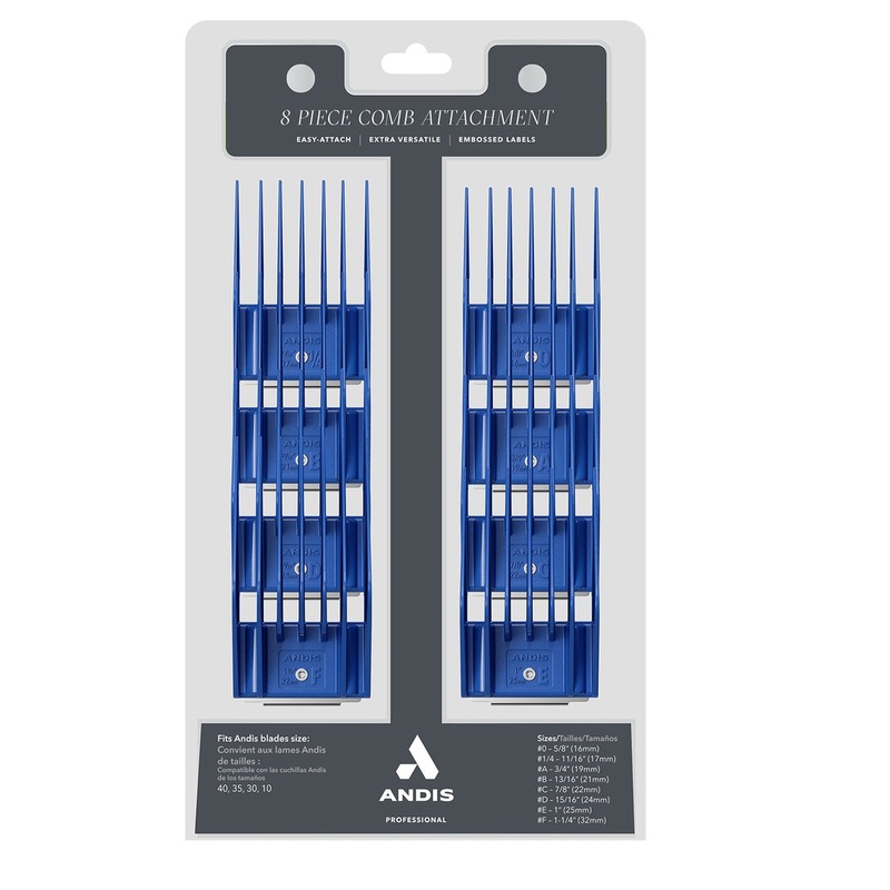 Show Them Your A-Game. Bring your ideas to life with this eight-piece large attachment comb set. Each high-quality comb snaps onto Andis detachable blades (size 30, 15, 10 or 9) for safe, accurate cutting. Switch between lengths quickly to achieve the look you envision.