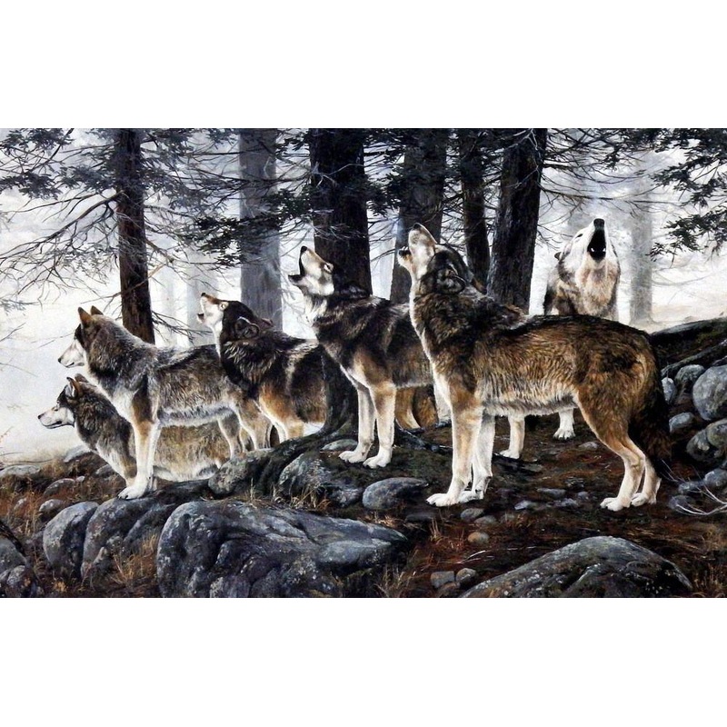 In the art print Primal Song by Andrew Kiss, the wolf pack issounding a warning that they are prowling thearea.Wolves howl for a variety of reasons. Pack members will chorus howl to defend their territory and rally the pack together. Most howls heard in th