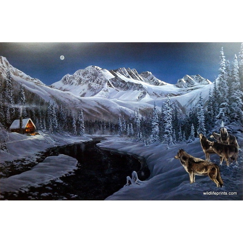 In the Andrew Kiss print WINTER GLOW, a remote mountain cabin is the audience for the moonlight performance of a howling wolf pack. This open edition print is available in an unframed image size of 29"x19".