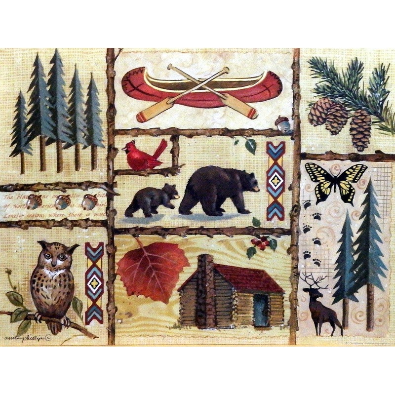 This Anita Phillips print shows the many things to see and do while on a Northwoods camping trip. While roughing it in a rustic log cabin or canoeing down a peaceful river, the camper may see bears, owls, and deer up close. Such is the JOY OF CAMPING.Avail