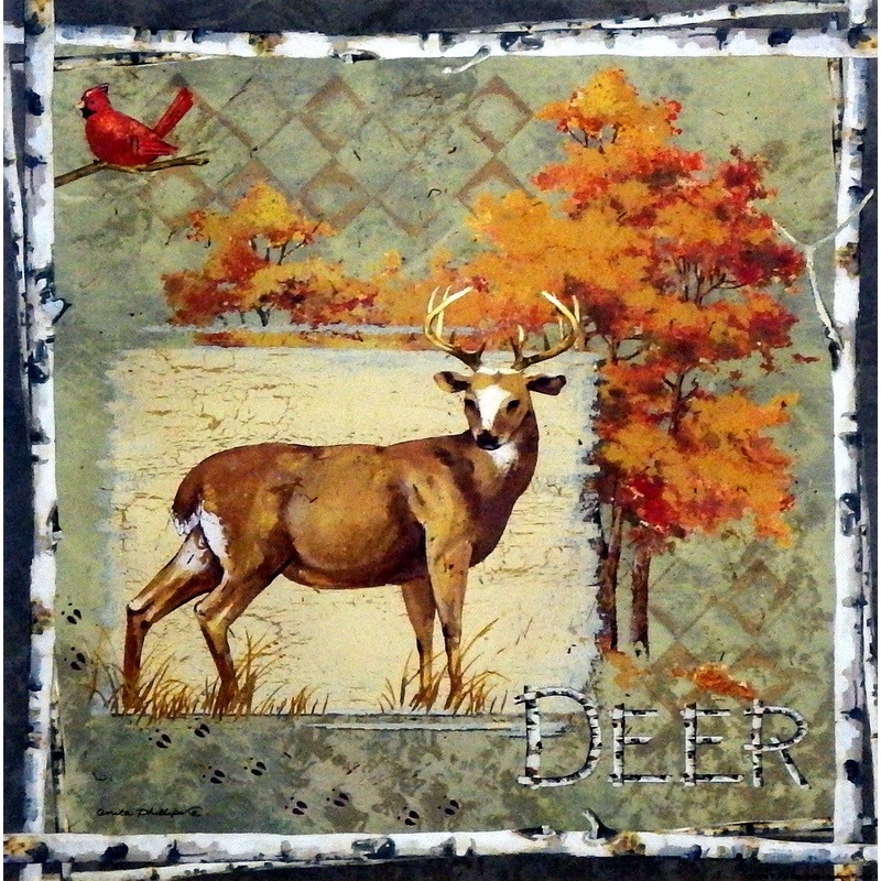 Anita Phillips picture DEER ON GREEN provides an autumn setting for a whitetail deer and his little cardinal friend. She has painted a birch-like frame around the print giving it that Northwoods look — great for cabin or lodge wall decor.