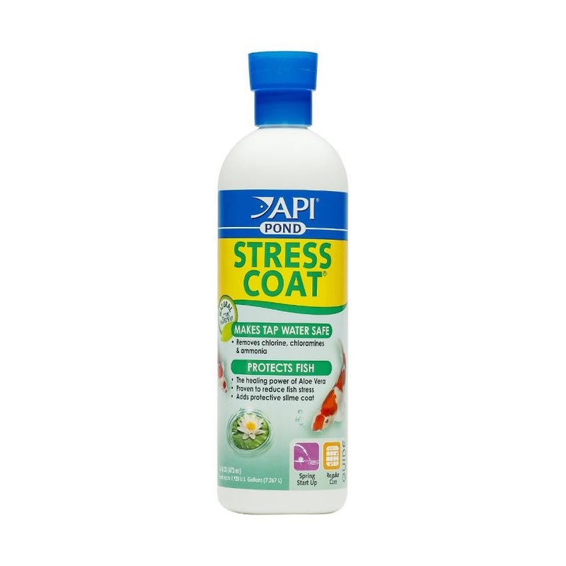 PRODUCT SUMMARY:API Pond Stress Coat acts as a unique water conditioner that replaces the natural slime coating on the skin of your pond fish when it has been damaged by handling, netting, or other forms of stress, and prevents the loss of internal fluids