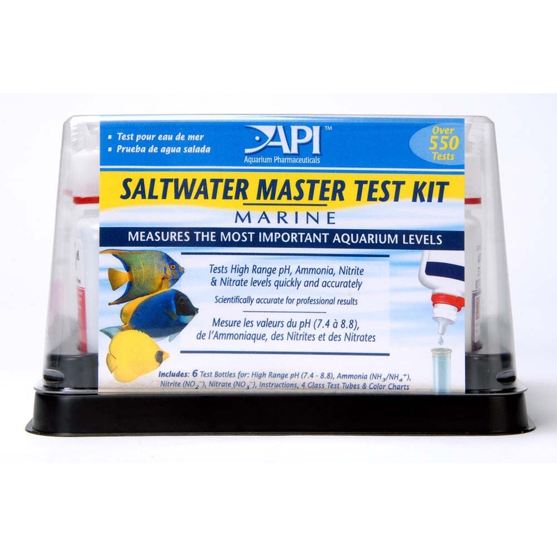 A complete kit for testing saltwater & reef aquariums.Test include:high range pH, ammonia,nitrite,nitrate,4 test tubes, tray & rack.Tests water 4 ways to protect marine fish from dangerous water conditions.