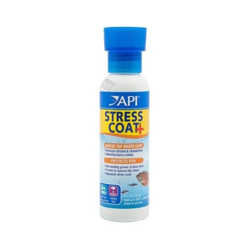 PRODUCT SUMMARY:API Stress Coat makes tap water safe for fish by removing harmful chemicals from tap water, and contains the healing power of Aloe Vera to reduce fish stress by 40% and to heal damaged tissue and wounds. API Stress Coat also reduces electro