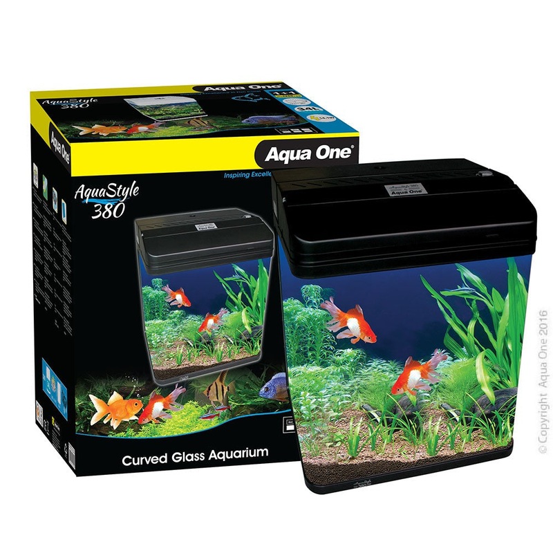 Aqua One AquaStyle 380 Gloss Black (52016GBK)Aqua One AquaStyle range caters to all levels of fish keeping with a hinged lid and top filter to keep the water clean. The curved design of the aquarium offers seamless viewing without distortion whilst the ene