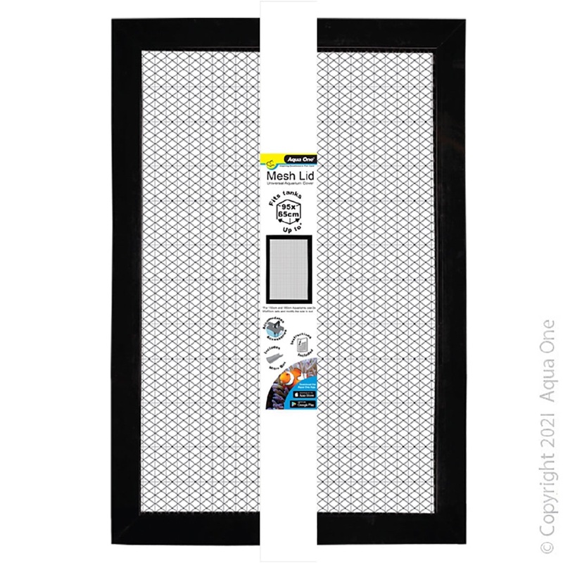 Aqua One Mesh Lid 95x65cm (10582)Aqua One Mesh Lids sits effortlessly on your open-top aquarium whilst providing a secure environment for your aquarium inhabitants. The sleek and durable plastic frame and nylon mesh construction can be customised to accomm