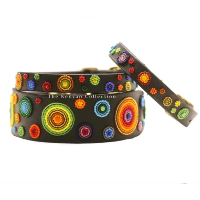 Arani Dots African Beaded Dog Collar & Leash CollectionA funky spin on our Rainbow Collection. Scattered Dots on Brown Leather. Simply Gorgeous! Customers tell us these are the highest quality and most unique beaded collars they have ever seen. The beading