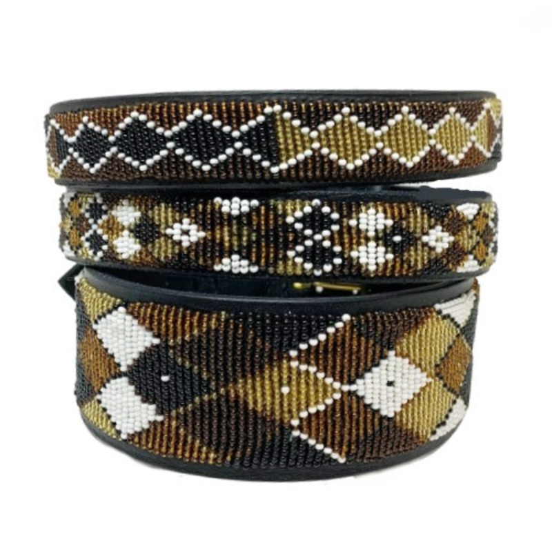 Argyle - EarthAfrican Beaded Dog Collar & Leash CollectionEarth colored beads on brown leather. Simply Gorgeous! Customers tell us these are the highest quality and most unique beaded collars they have ever seen. The beading is done by Maasai "mamas" worki