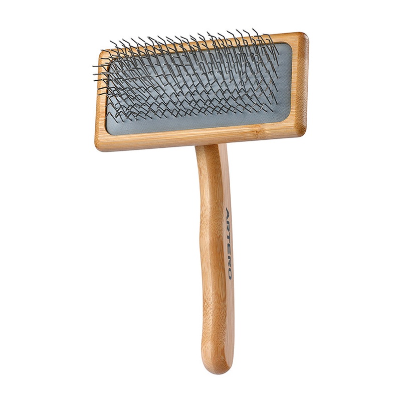The Mat Breaker Slicker has extra long & wide pins to easily target tangles, mats and shedded coat. Ideal for large breeds with dense coat (double-coated breeds, thick curly coats, etc.) Eco-friendly, made of bamboo. Recyclable cardboard packaging. How to