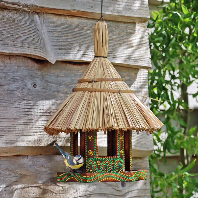 Introducing the newest products to the Bali Island Range, the Artisan Hexagonal Thatched Bird Table, a unique and handcrafted product built by Balinese artisans using sustainably sourced timber. Hand-painted in vibrant green using a traditional dot painting technique, this hexagonal bird table features a conical thatched roof in an authentic Indonesian style. It provides a perfect space for small birds to feed safely on seeds, peanuts, suet, and other safe food scraps, while its smaller entrances prevent larger species like crows, pigeons, and magpies from accessing the food.