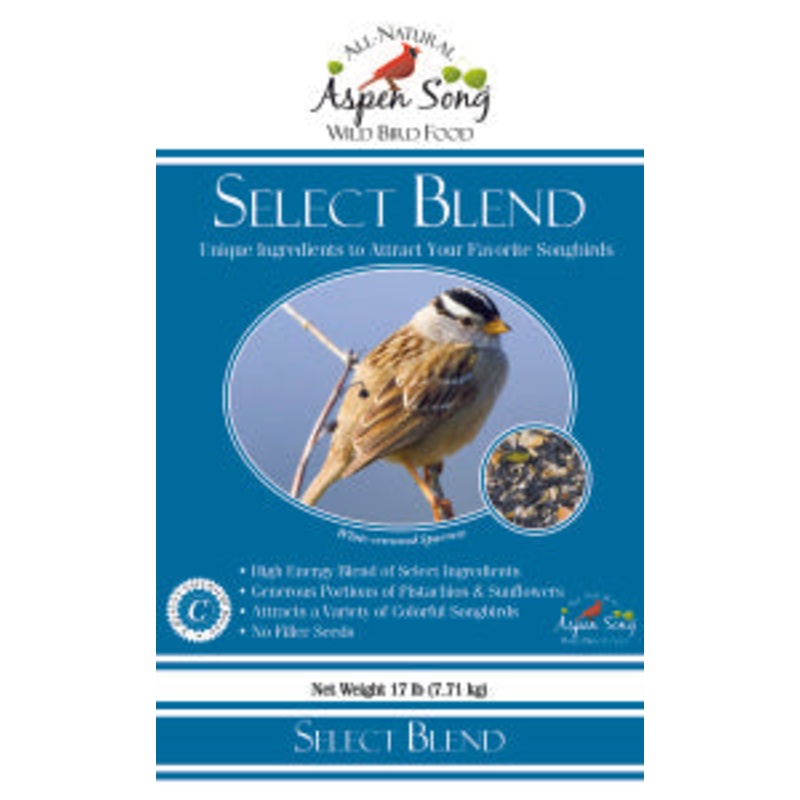 Aspen Song Select Blend contains many of the favorite seeds of backyard songbirds. Black oil sunflower seeds have soft shells that allow easy access to their high energy kernels. Pistachios simulate native tree seeds and are loved by arboreal birds and woodpeckers. Safflower seeds provide an important source of nutrition. White proso millet is a great source of carbohydrates and are especially loved by native sparrow species. Cracked corn and steam-crimped corn are perennial favorites of all seed-eaters. Select Blend is a great start to creating a bird sanctuary in your yard.