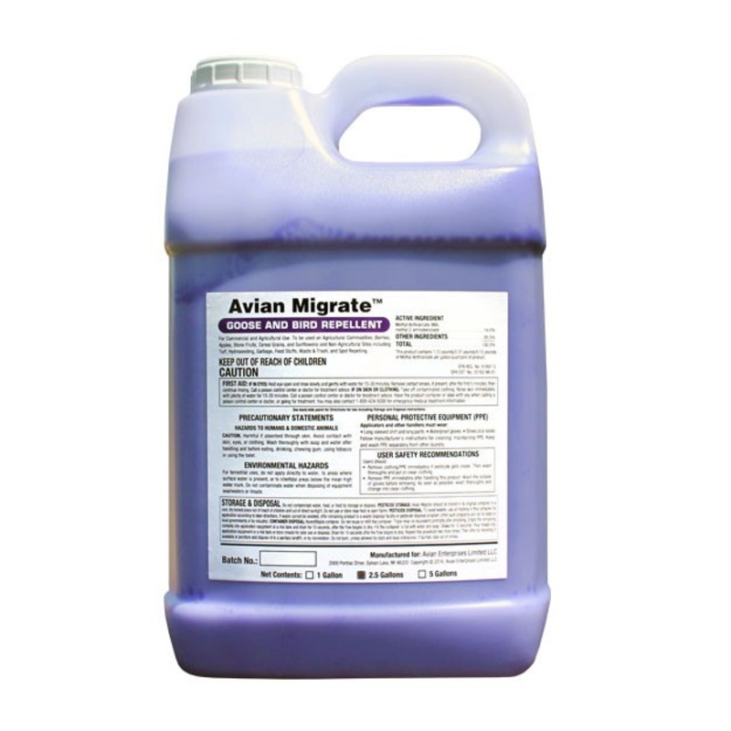 Avian Migrate Goose and Bird Repellentis a non-lethal liquid bird repellent that discourages geese and birds from congregating on golf courses, parks, athletic fields and around public buildings. Simply spray as directed - the effect is immediate and long