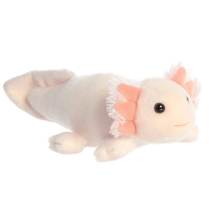 This lil' axolotl is ready to make a splash! This tiny axolotl is light pink with feathery gills surrounding her adorable face. Part of our miniature plush collection, this axolotl stretches 8" across. Collect them all!FEATURESThis axolotl may be tiny but