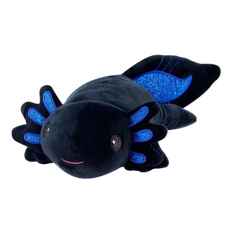 Did you know Axolotls in the wild are actually dark-colored? And they can shift their hue a few shades lighter or darker as needed for camouflage! See them in person in the Marsh Meadows habitat at the San Diego Zoo’s Wildlife Explorers Basecamp. This black axolotl plush is about 15 inches long from nose to tail, with a sweet face and blue glitter highlights.