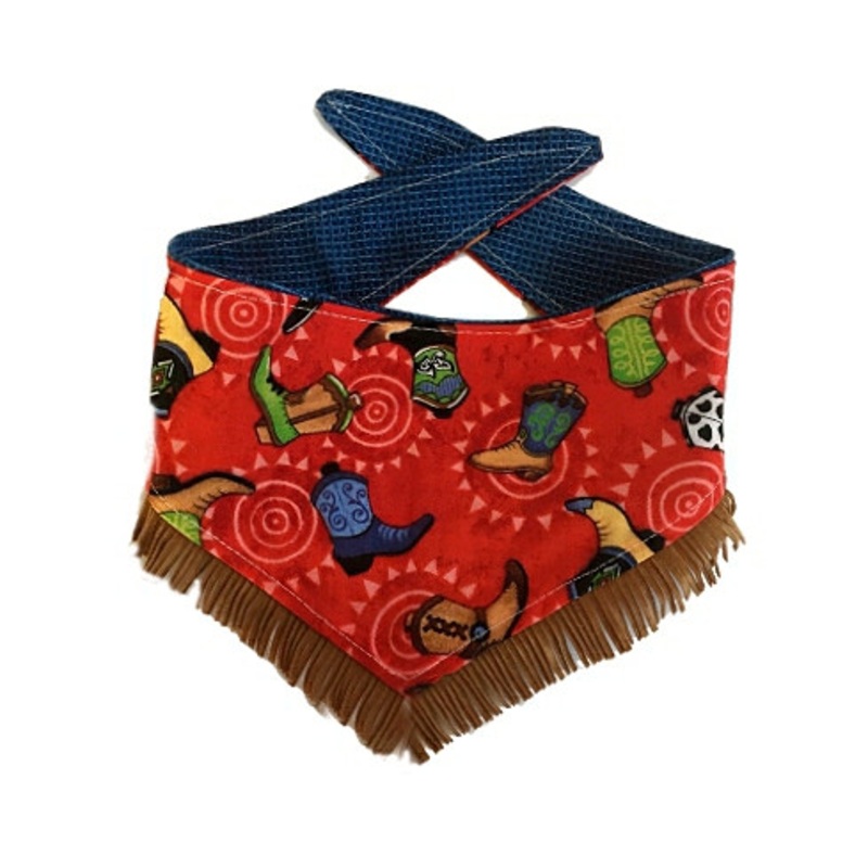 BuckARoo - Dog BandanaFor that little four legged cowboy or cowgirl! Adorable red cotton western print with colorful cowboy boots. Suede fringe compliments for a unique look! Just Ties around the neck like a scarf. XXS ha a choice of tie or velcro. One of