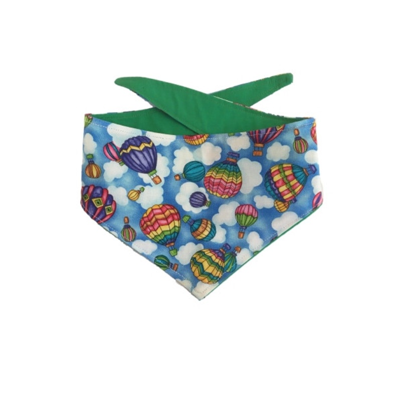 Dog Bandana - Hot Air Balloons in Cloudy SkiesHot Air Balloons in Cloudy Skies Dog Bandanas for the balloon enthusiasts! Reversible with a green cotton on the opposite side. Adds character to any doggie tee or outfit. Bandana is cut with a curve so it fits