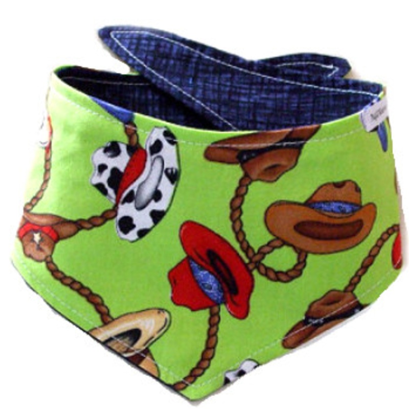 Dog Bandana - Lime Green WesternFor that cowboy or cowgirl, don't forget the hat. Bright Lime Green with colorful cowboy hats, so chic! Adds character to any doggie tee or outfit. Bandana is cut with a curve so it fits on the neck comfortably. Machine wash