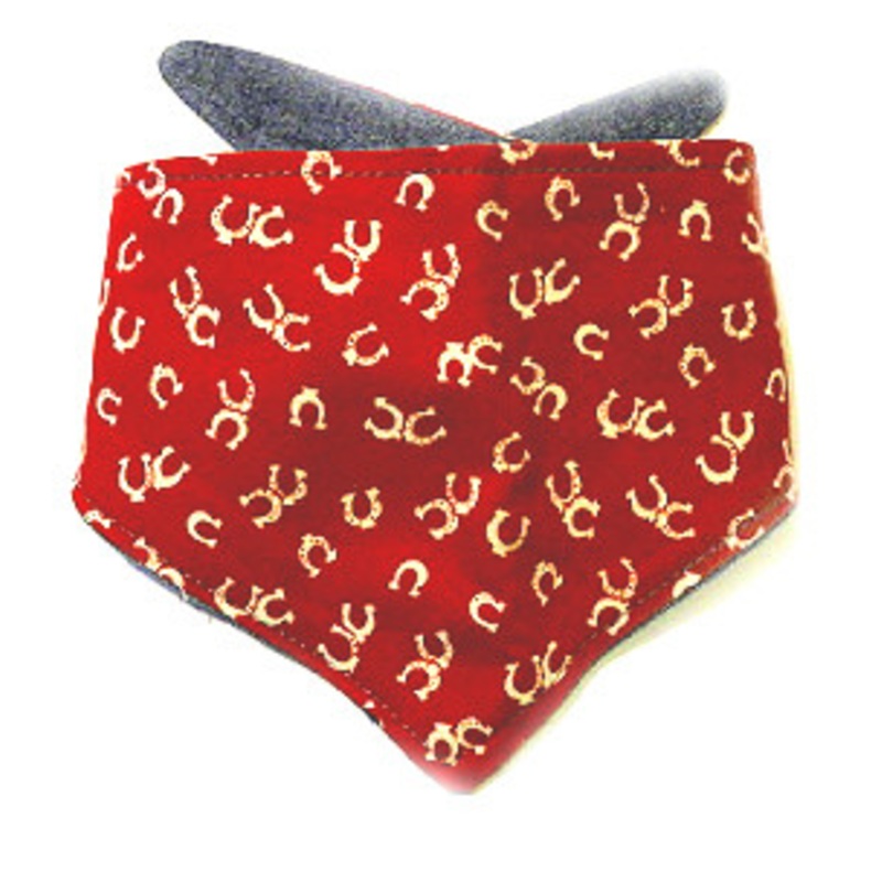 Red Horseshoe Dog BandanaOne of our popular bandanas for the little cowboy or cowgirl! Red Horseshoe print doggie bandana with lightweight blue denim on the opposite side makes it reversible. Adds character to any doggie tee or outfit. Bandana is cut with