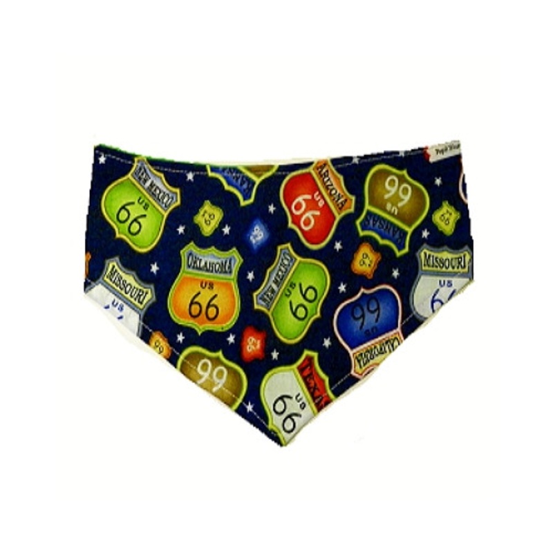 Dog Bandana - Route 66This unique bandana is a must for Route 66 fans! Adds character and personality to any doggie tee or outfit. Bandana is cut with a curve so it fits on the neck comfortably, just ties like a scarf. Machine wash, hang dry. 100% cotton.