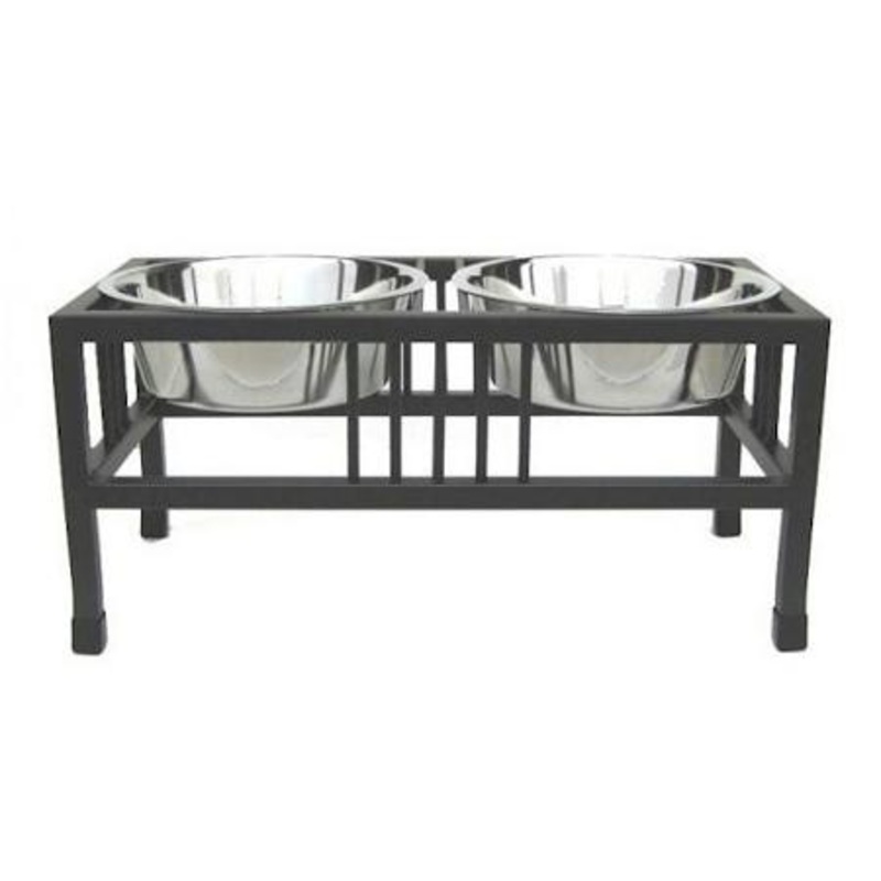 TheBaronDouble Dog Dineris the reigning favorite of discerning dog owners. This heavy-duty raised dog bowl stand features wrought iron mission bars and a subtle curvature of its legs, making it at home in both contemporary and traditional settings. TheBaro