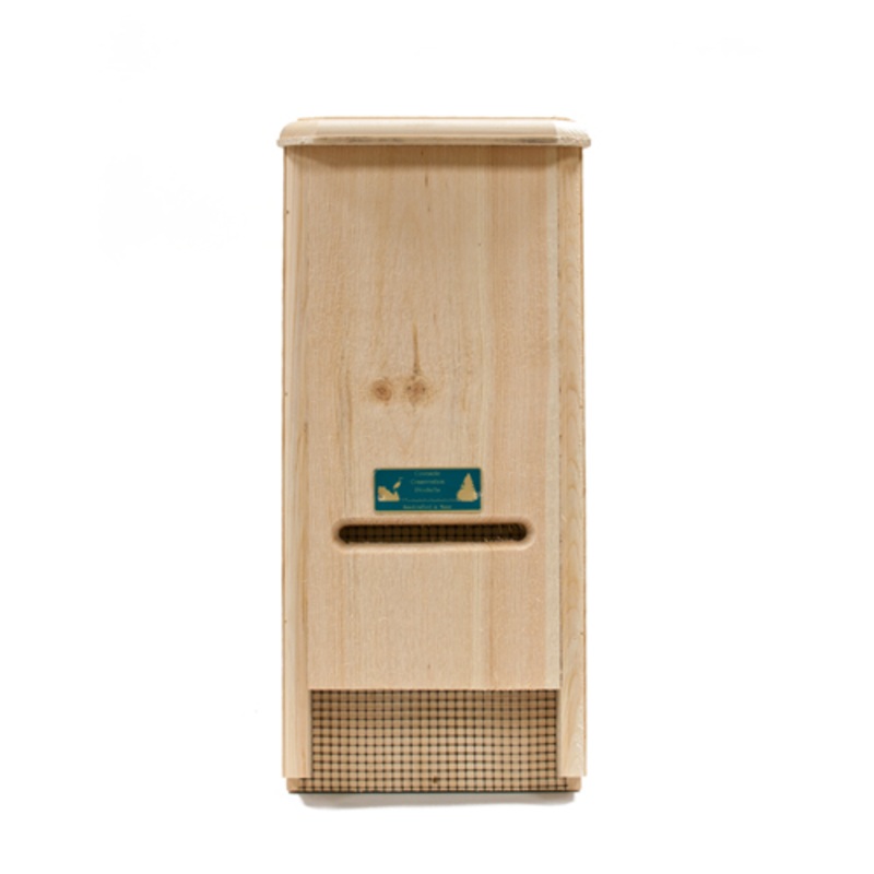 BATchelor Pad Bat House – houses up to 30 bats in a single chamber. Features include a large screened landing pad, roughed interior surface and an echolocation slot. Designed for cooler locations preferred by solitary males, but also suitable for a small nursing colony.