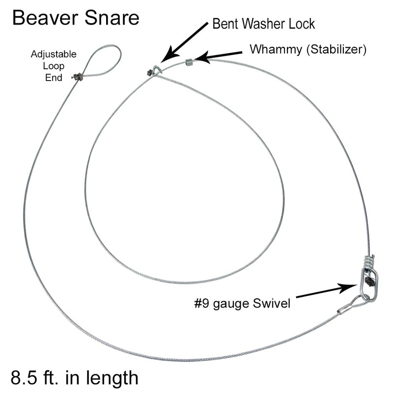 Finally, a Beaver Snare with a #9 swivel where it needs to be...as close to the animal as possible. Made from 3/32" galvanized aircraft cable and 8.5 feet long, this snare also has a whammy for ease of positioning. A Penny lock makes it easy to remove the