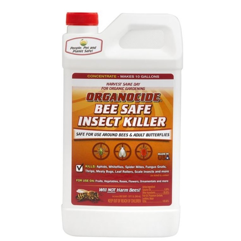 OrganocideBEE SAFE Insect Killer,when used as directed as an organic bug spray or soil drench, is safe to use around beneficial or large insects such as bees, beetles, lady bugs & adult butterflies. A natural insecticide for plants, it kills the eggs, larvae, nymphs and adult stages of over 25 soft-bodied insects including (but not limited to) aphids, hemlock wooly adelgid, citrus rust mites, leafrollers, mealy bugs, scale insects, spider mites, thrips, whiteflies, and fungus gnats. The Quart Concentrate can be used as a soil drench, and is extremely effective at eliminating the life cycle of fungus gnats and mites.