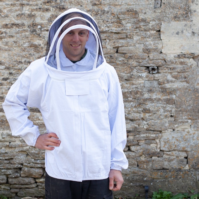 Large adult size bee keeping jacket with detachable hood. Made in heavy cotton, the jacket features two front pockets, collar, centre zip, elasticated cuffs and elasticated waistband.