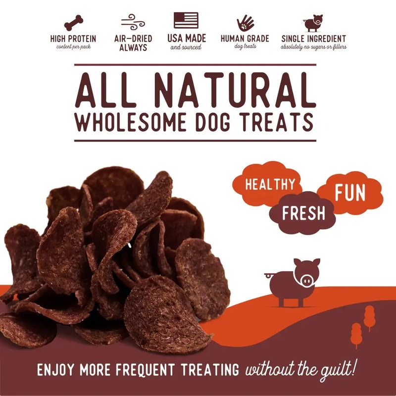 Your dog will beg and bark for these high-protein high-energy pork strips made from 100% Pork. Prepared pork hearts using the time honored tradition of air-drying, which locks in all of the nutrients, vitamins and essential fatty acids and keeps your best friends snack free of preservatives and fillers.