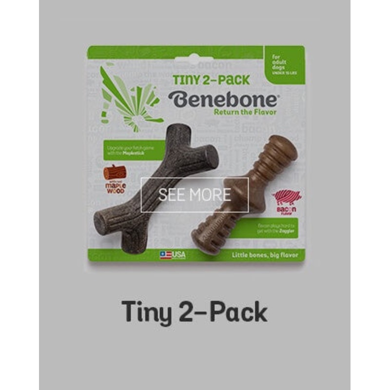 Benebone Bacon Stick & ZagglerLittle bones, big flavor!Our Tiny 2-Packs are for adult dogs under 15 pounds. Just because theyre little doesnt mean they cant join in on the fun. These Benebones are as hard and durable as the rest of our chew toy line. Tiny