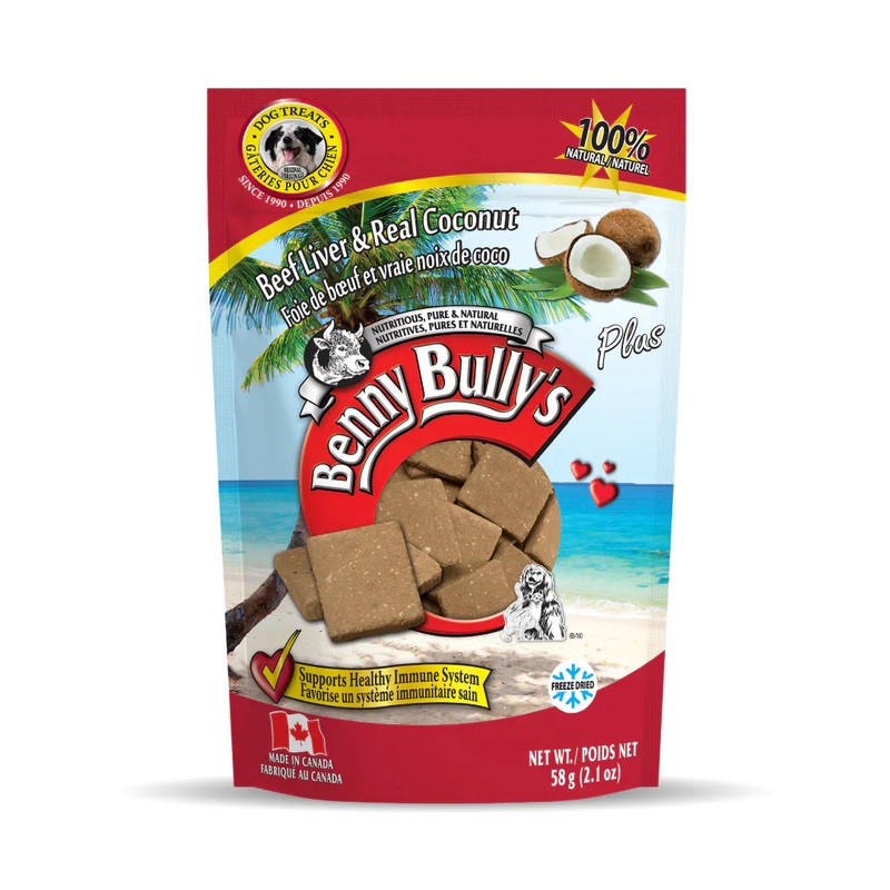 Benny Bully’s Beef Liver Plus Coconutdog treats provide a perfect blend of nutrition and flavor, making it irresistible to any dog out there – specifically designed to boost your dog’s overall health! Our treats are packed with nutrients that are essential for your dog’s wellbeing. Coconut oil is a beneficial source of fat with immune-boosting properties and has antibacterial and antifungal properties. It helps improve your dog’s skin and coat, strengthens digestion, and provides disease-fighting antioxidants.