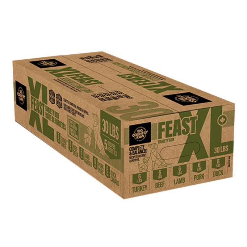 The ultimate chicken-less feast offering in a variety box - offering 5 proteins! Each box contains 6 lbs of XL Duck, 6 lbs of XL Turkey, 6 lbs XL Beef, 6 lbs XL Pork and 6 lbs of Lamb.Perfect for dogs and puppies of all ages - very convenient for multi dog