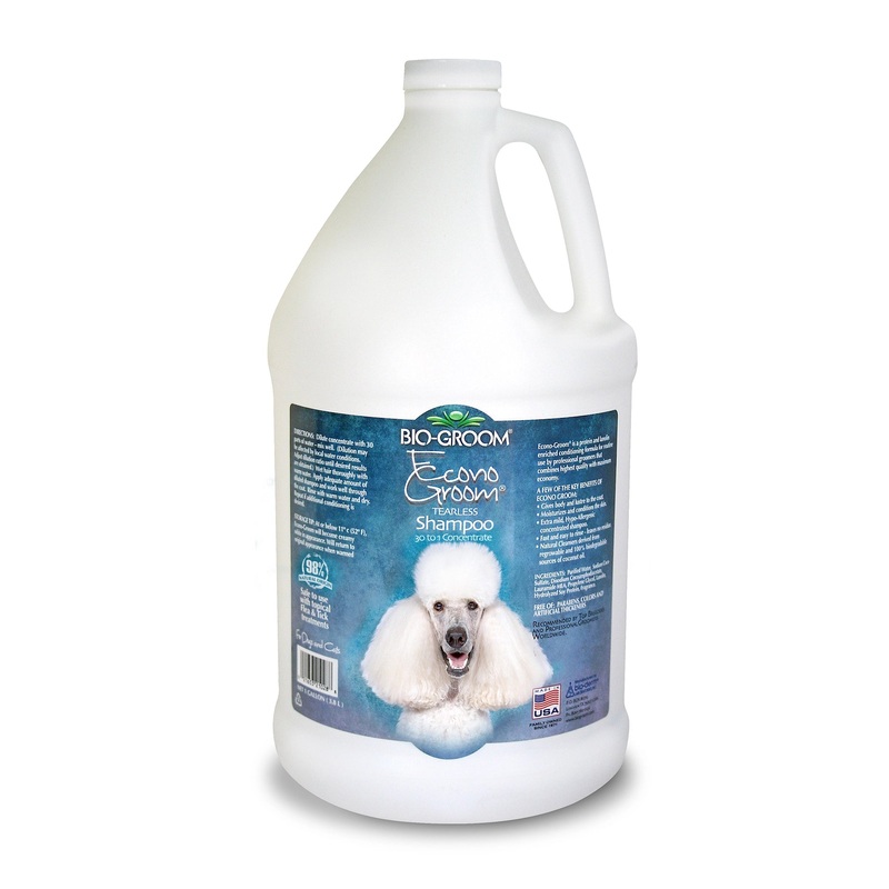 Econo-Groom is a 30:1 super-concentrated dog shampoo. In addition to being concentrated, this dog shampoo is extra mild, hypoallergenic, and tearless. The cleaning and conditioning formula is protein and lanolin-enriched and combines high quality with maximum affordability. Econo-Groom moisturizes and conditions the skin while giving body and luster to the pets coat. Best of all, it is fast and easy to rinse and leaves no residue!